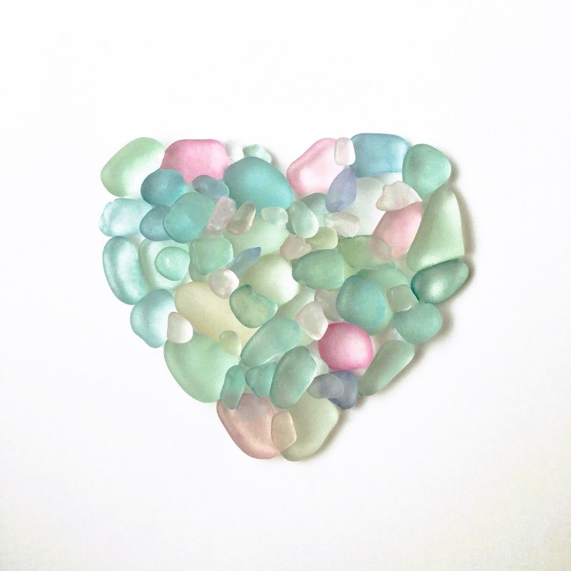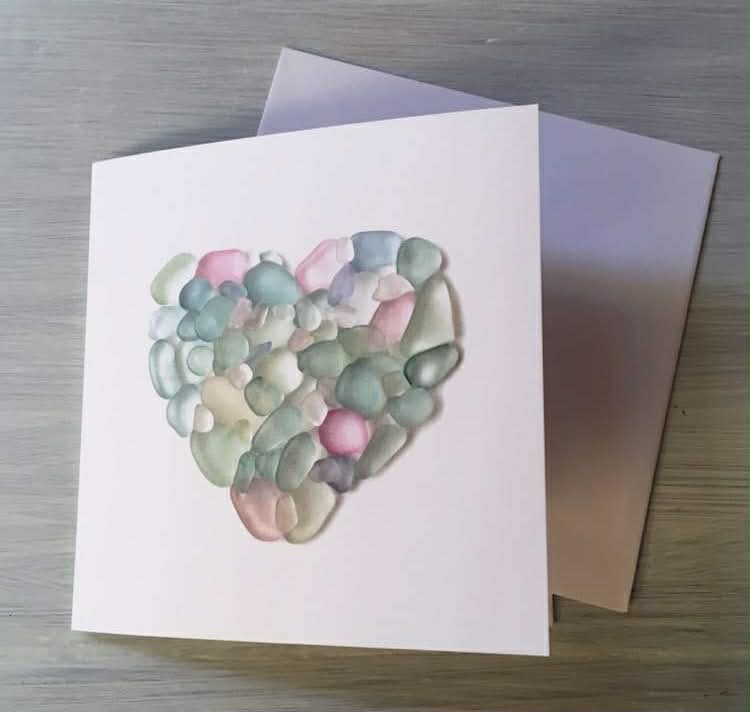 Tiny Boat Studio brings you this simple heart shaped image. We think it makes a lovely greeting card suitable for a variety of occasions and sentiments. The gentle, muted pastel colours, such as seafoam green, tranquil blue, and soft pink, can evoke a sense of calmness, serenity and peace. It would also make a nice little framed picture and is 15.24 cm x 15.24 cm  (6 x 6 inches). The card is blank inside. Please note the card is a photographed art print not actual glass.