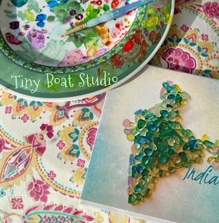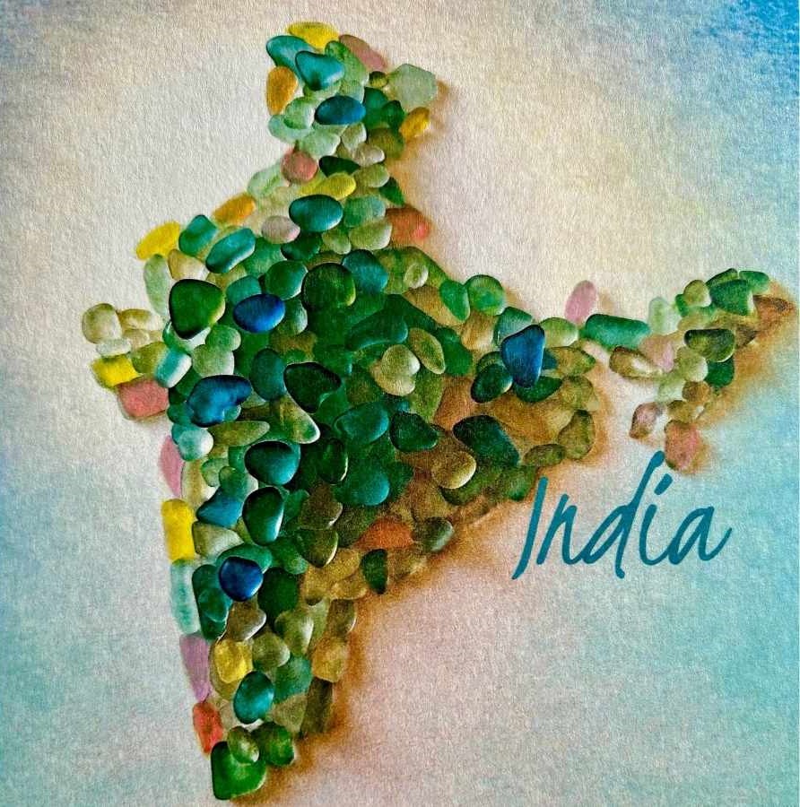 Tiny Boat Studio enjoyed creating this card of beautiful India arising and shining in a soft sun. The name ‘India’ is printed in teal. Our image is a celebration of India with its tapestry of diverse landscapes, from the Himalayan peaks to tropical coastlines! Each card will carry slight variations as it is hand finished in acrylic with touches of red, pink, saffron, yellow, green and blue. We think it would look lovely framed. Please note this is a photographed art image not actual sea glass. The card is 15.24 cm x 15.24 cm (6 x 6 inches) and blank inside.