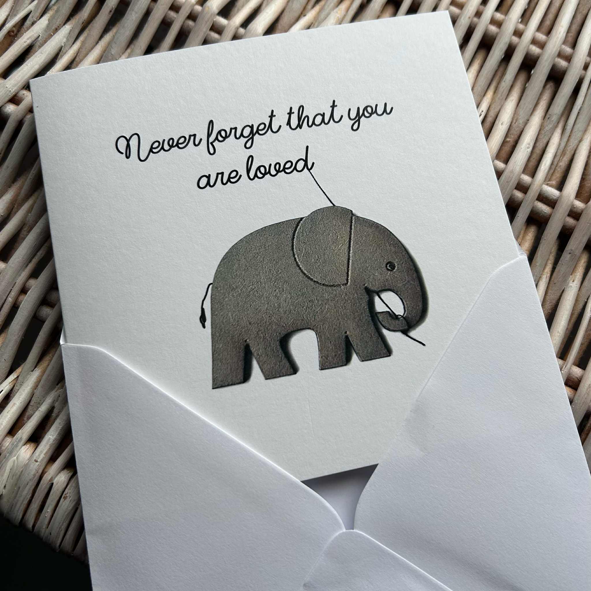 Everyone deserves to be reminded that they are valued, cared for, and loved! Let Tiny Boat Studio’s gorgeous little elephant help you communicate this lovely message. Please note this is a flat photographed art image not 3D. Our card is 15.24 cm x 15.24 cm (6 x 6 inches) and blank inside.