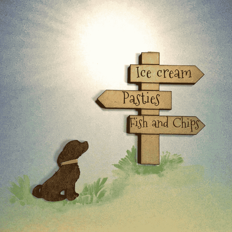 Our little dog is ‘spoilt for choice’ over what he would like for tea as the sun sets! What would you choose? Please note our card is a photographed art image not wood. The card is 15.24 cm x 15.24 cm (6 x 6 inches) and blank inside.
