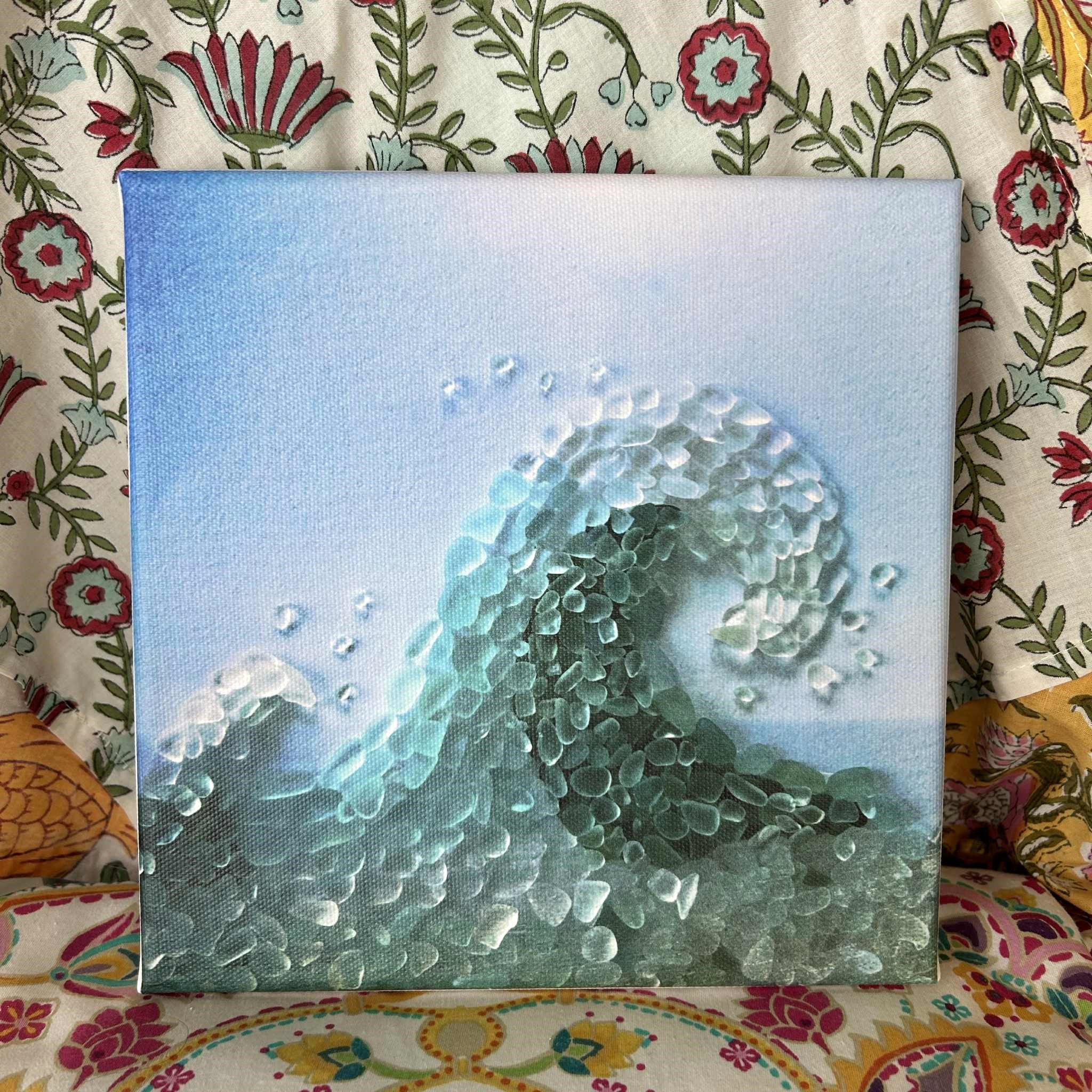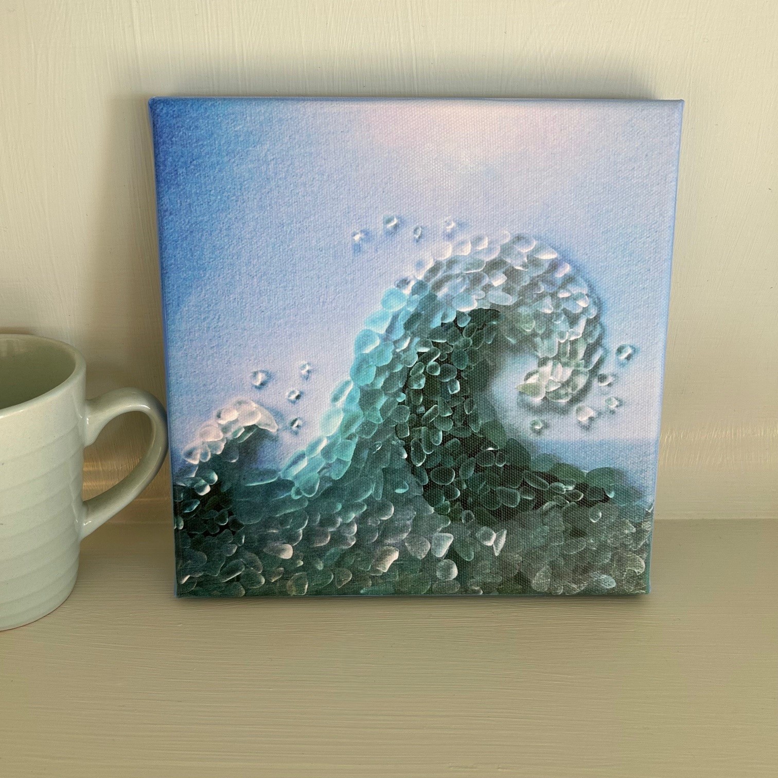The wonder of a wave breaking on the shore exhibits immense natural power and serene beauty. Mesmerising to watch, waves bring a constant, rhythmic force along our coastlines. Tiny Boat Studio enjoyed creating this image! It could be placed on a shelf and surrounded by a few shells to bring instant coastal charm to any interior. This is a small canvas photo print. Size 20cm x 20cm. Please note this is a photographed image not actual sea glass
